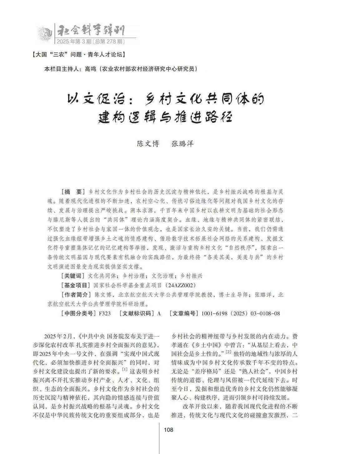 近日,北京航空航天大學人文社會科學學院(公共管理學院)陳文博教授、科研助理張璐洋在《社會科學輯刊》so米體育-NBAso米直播第3期發(fā)表《以文促治:鄉村文化共同體的建構邏輯與推進路徑》一文